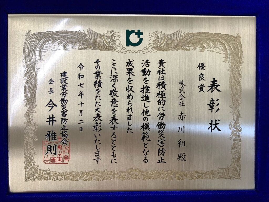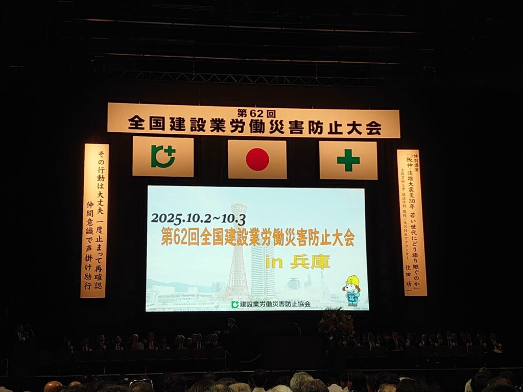 令和7年10月2日、3日に神戸ワールド記念ホールにて第62回全国建設業労働災害防止大会が開催され、優良賞(会社対象)を受賞しました。